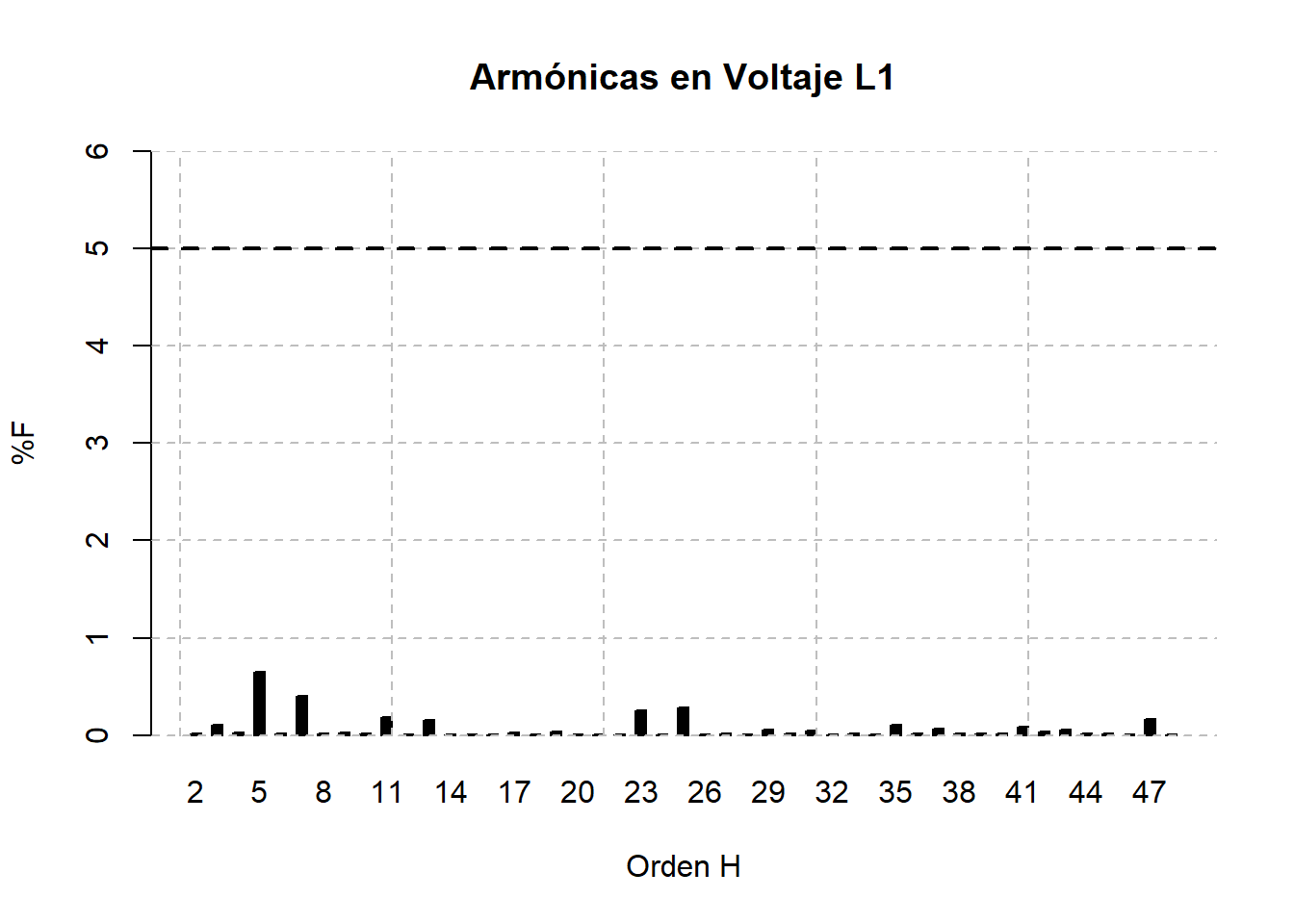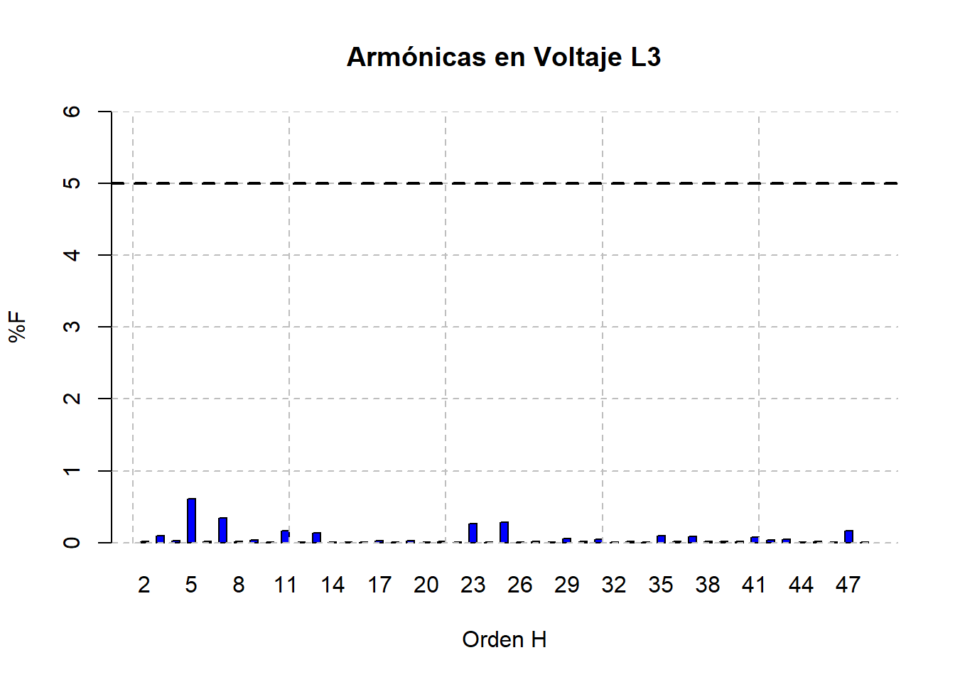 La DATD presentó un valor de 2.1% siendo el límite de 7.5%, lo cual es adecuado, pero la distorsión individual de la armónica 23ª, 25ª y 47ª fueron de 1.3%, 1.25% y 0.58% respectivamente, siendo los límites de 1.0%, 1.0% y 0.5%, respectivamente. Por lo que se recomienda revisar en los niveles de 13.8 kV o 480 V, donde se puedan eliminar estas armónicas, se recomienda revisar en los tableros donde se tengan convertidores que usen técnicas de conmutación PWM o similares, posiblemente sean en los hornos de fusión. Este comportamiento se observó el mes anterior, por lo que se recomienda poner atención a estas armónicas.